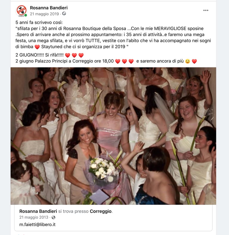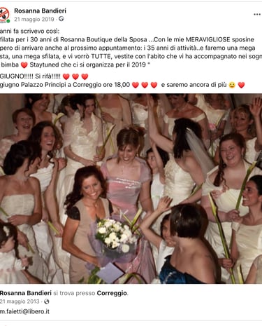Sono stata per 40 anni la " mamma" delle spose di Correggio e Emilia Romagna, in quanto ero titolare di "Rosanna boutique della Sposa" , Le ho seguite nella scelta dell' abito, di tutto il contorno al loro matrimonio e le ho seguite anche nel servizio fotografico dell' evento. Ho sempre avuto la passione per la fotografia, che ho affinato in quasi 40 anni in cui la pratico.Soprattutto nell'ambito della natura, dello sport ( sono stata ciclista amatoriale, podista, ultramaratoneta, trailer, per più di 30 anni ) ed ora escursionista e trekker..